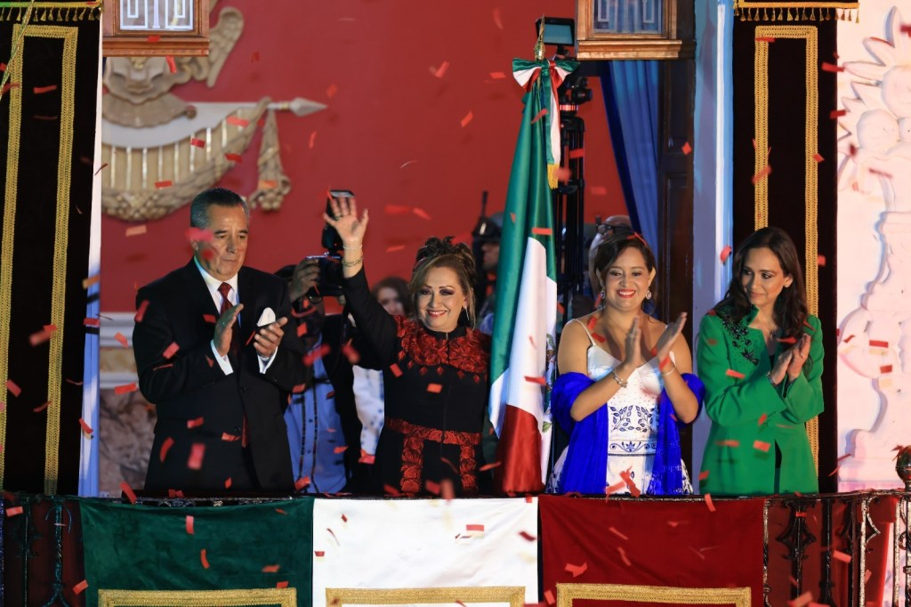 Desde el balcón central de Palacio de Gobierno, acompañada por sus hijas Mariana y María Fernanda Espinosa de los Monteros Cuéllar y de su esposo Salvador Ballesteros Rodríguez, la mandataria estatal ondeó la Bandera Nacional y recordó a los hombres y mujeres que participaron en el movimiento de Independencia.